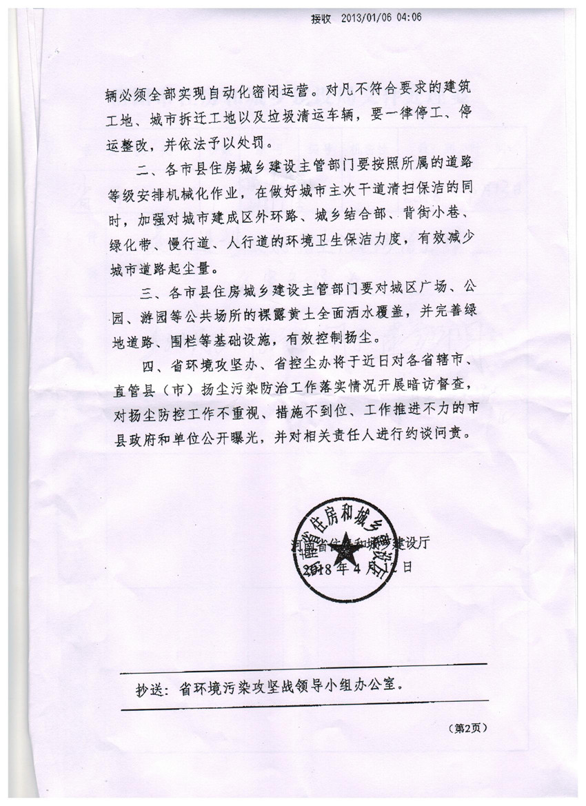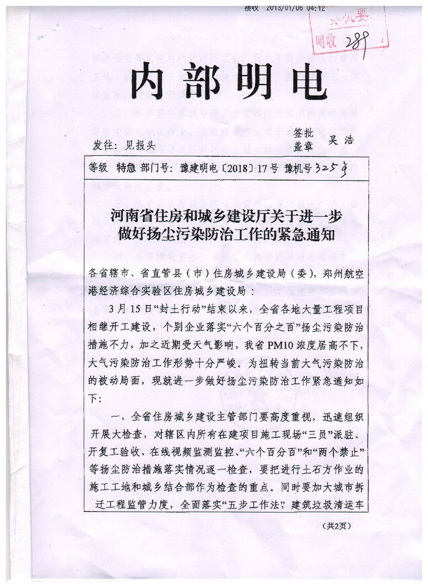 現將《河南省住房和城鄉建設廳關于進一步做好揚塵污染防治工作的緊急通知》(豫建明電[2018]17號)轉發給你們,請按照通知要求,認真貫徹執行。