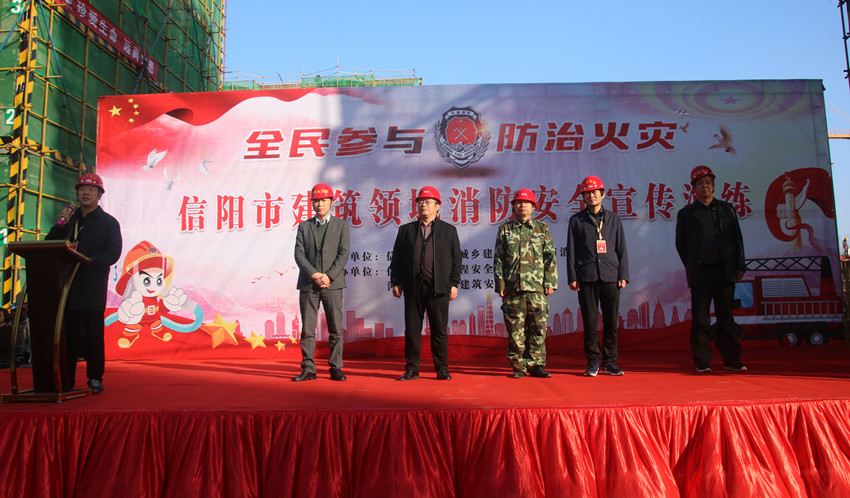 此次活動由信陽市住建局和信陽市消防支隊聯合主辦,由公司和信陽市安監站共同承辦,信陽市住建局分管副局長張奔、信陽市安監站站長馬其峰、副站長楊傳臣、信陽市消防支隊消防專家陳波等領導參加活動,公司董事長、總經理吳萬仁、副總經理吳建功出席活動。活動由信陽市安監站站長馬其峰主持,張奔局長擔任總指揮長。