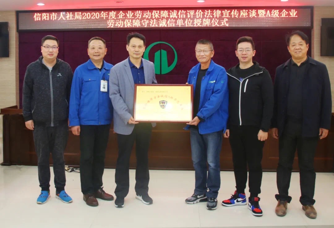 公司再次榮獲“信陽市勞動保障守法誠信A級示范單位”榮譽稱號