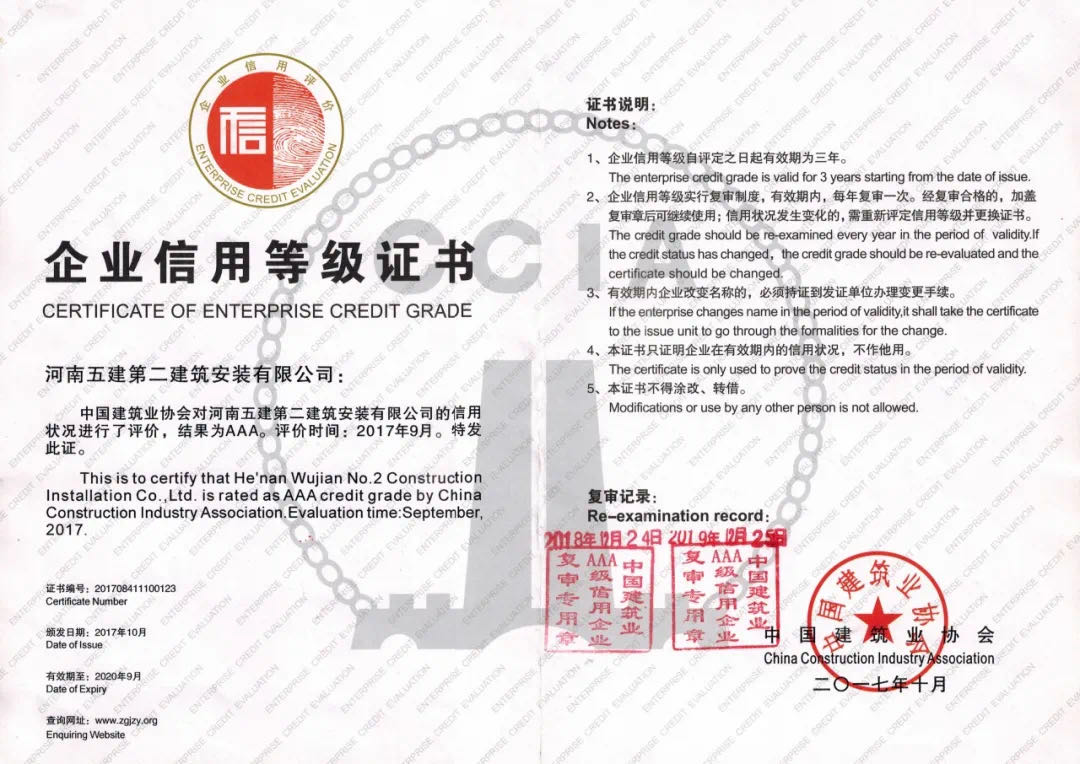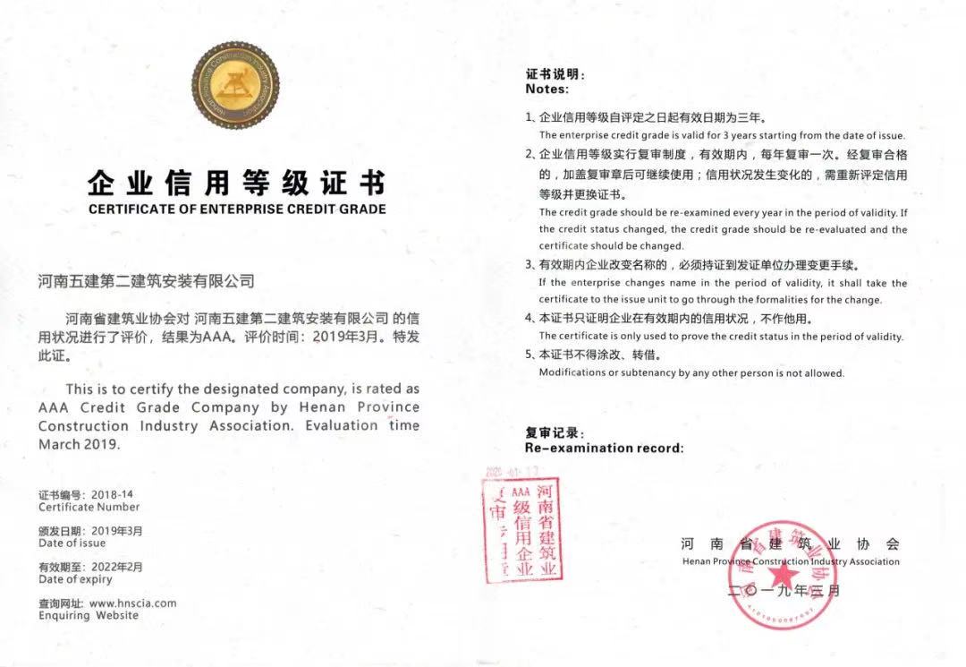 河南省建筑業(yè)協(xié)會(huì)AAA級(jí)信用等級(jí)證書(shū)