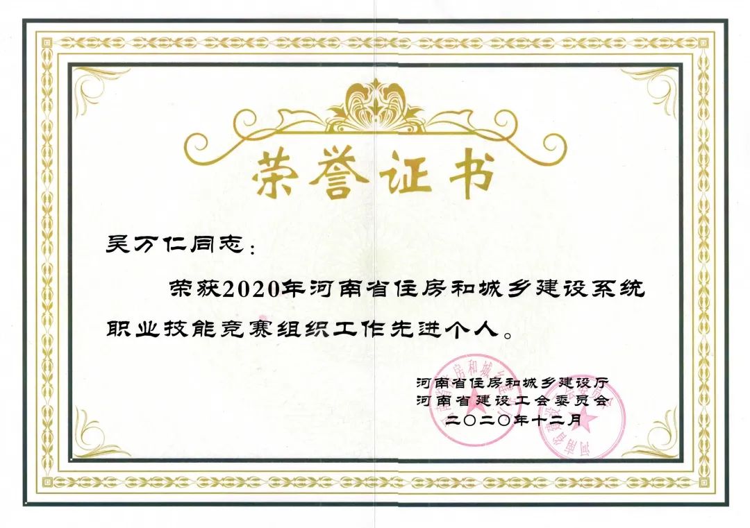 一分耕耘一分收獲,得益于積極的組織以及在競(jìng)賽中取得的優(yōu)異成績(jī),公司榮獲“2020年河南省住房和城鄉(xiāng)建設(shè)系統(tǒng)職業(yè)技能競(jìng)賽組織工作先進(jìn)單位”稱號(hào)、吳萬(wàn)仁董事長(zhǎng)榮獲“2020年河南省住房和城鄉(xiāng)建設(shè)系統(tǒng)職業(yè)技能競(jìng)賽組織工作先進(jìn)個(gè)人”稱號(hào)。