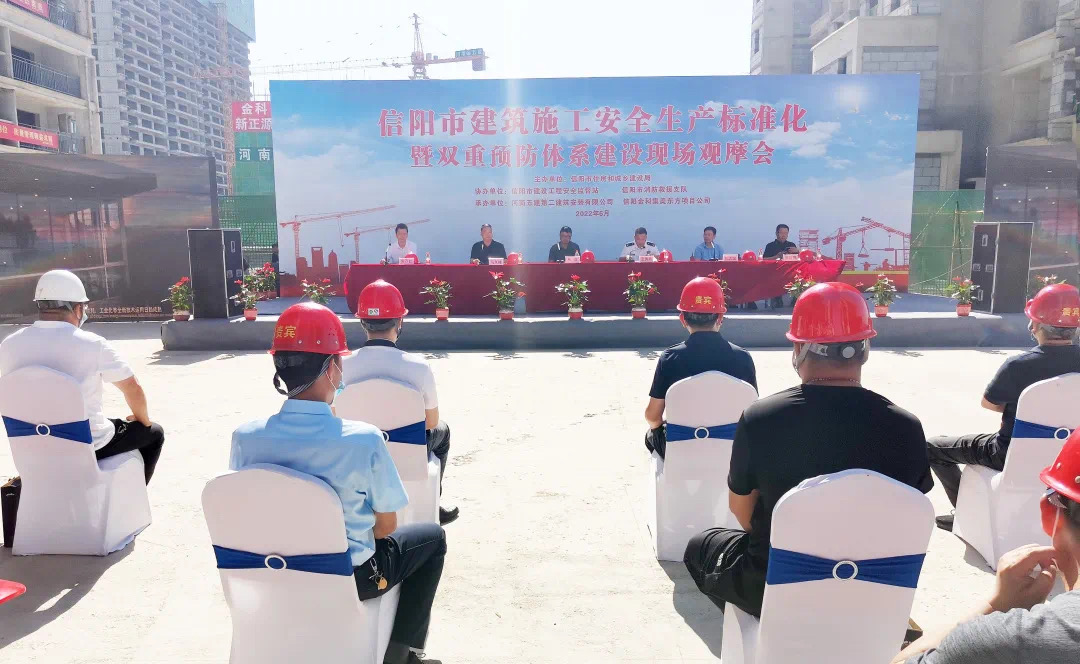 為深入開展全國第21個“安全生產月”活動,提高工程施工安全標準化水平,推進雙重預防體系建設工作,6月16日上午,信陽市建筑工程安全生產標準化暨雙重預防體系現場觀摩會在我公司金科集美東方項目現場隆重舉行。市住建局黨組成員、總規劃師張立、市消防救援支隊副支隊長王秀春、建管科科長陳志國、安監站站長馬其峰及高新區住建局局長張彥偉等領導參加活動。公司黨委書記、董事長、總經理吳萬仁受邀出席活動并講話。整場活動由會議階段、演練階段和觀摩階段三部分組成,由安監站站長馬其峰負責主持。